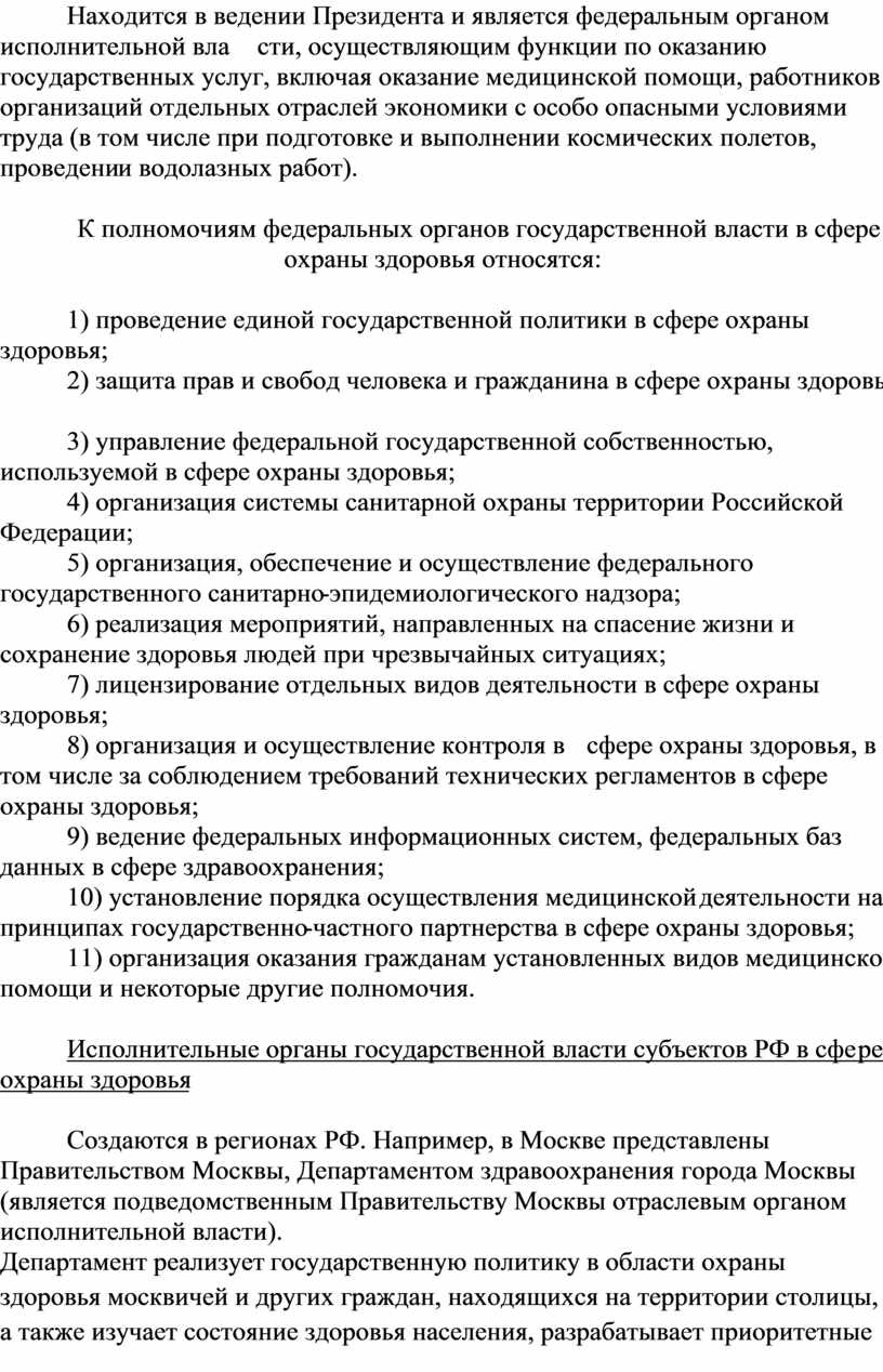 Обеспечивает проведение единой государственной политики в области здравоохранения, принимает необходимые меры по реализации прав граждан на охрану здоровья; организует, направляет, координирует и контролирует деятельность всех федеральных органов исполнительной власти в сфере охраны здоровья (министерств и ведомств); разрабатывает, утверждает и финансирует федеральные программы развития здравоохранения.