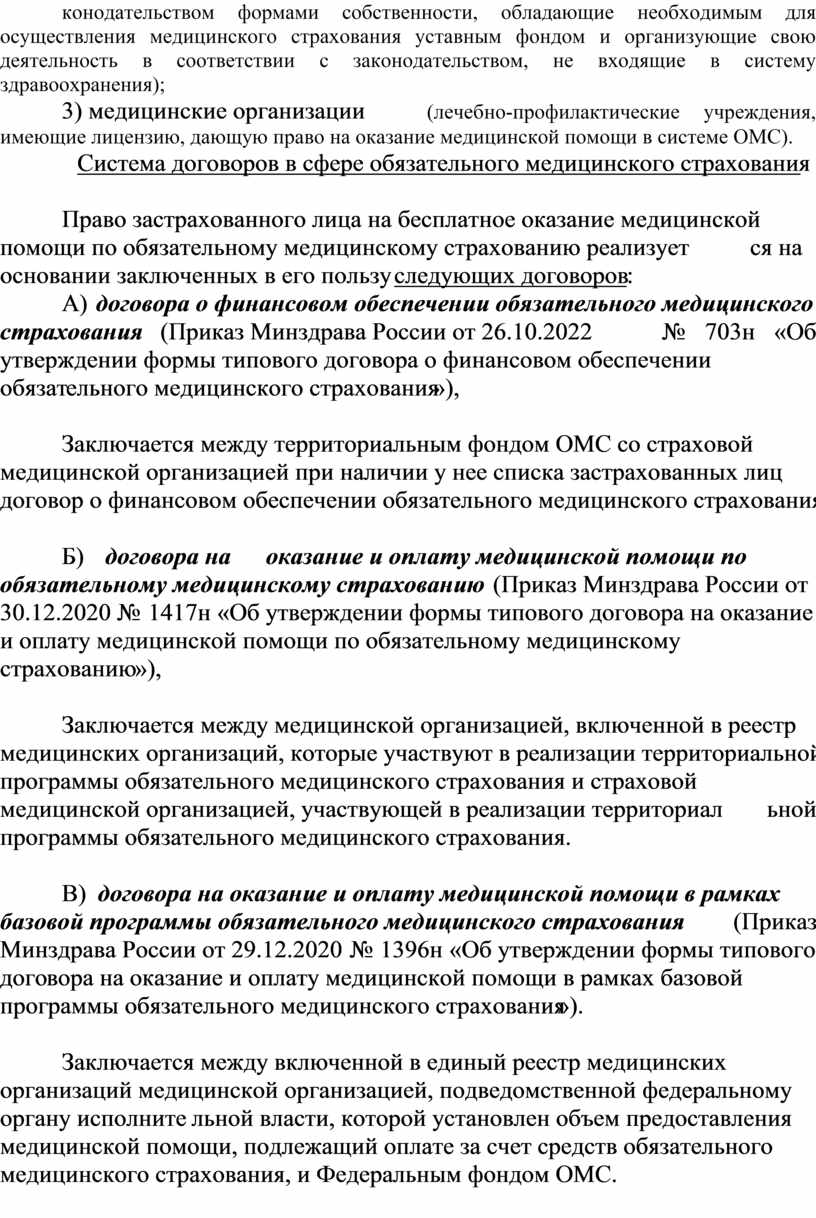 Б) договора на оказание и оплату медицинской помощи по обязательному медицинскому страхованию (Приказ Минздрава России от 30.12.2020 № 1417н «Об утверждении формы типового договора на оказание и оплату медицинской помощи по обязательному медицинскому страхованию»),
