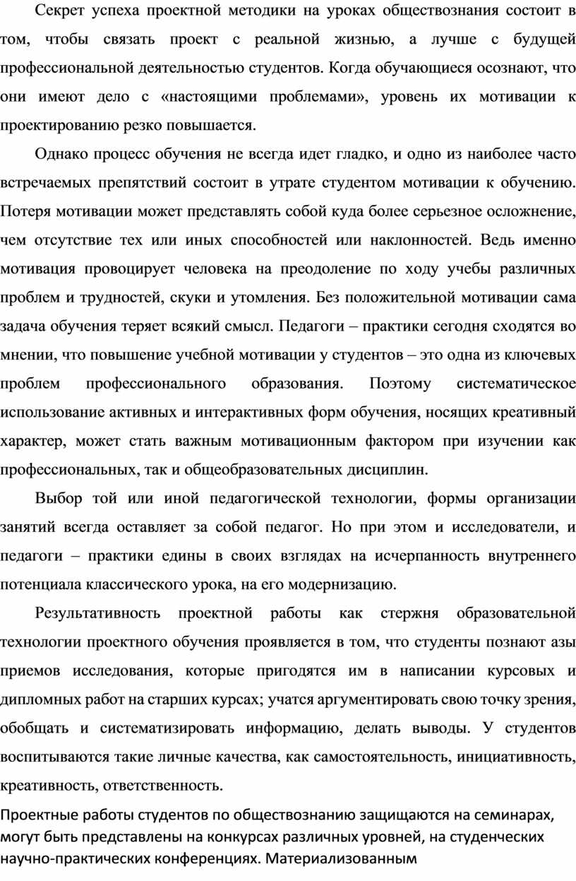 Секрет успеха проектной методики на уроках обществознания состоит в том, чтобы связать проект с реальной жизнью, а лучше с будущей профессиональной деятельностью студентов. Когда обучающиеся осознают, что они имеют дело с «настоящими проблемами», уровень их мотивации к проектированию резко повышается.