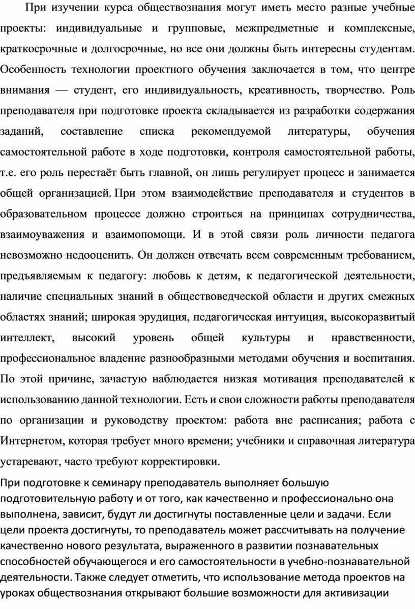 При подготовке к семинару преподаватель выполняет большую подготовительную работу и от того, как качественно и профессионально она выполнена, зависит, будут ли достигнуты поставленные цели и задачи. Если цели проекта достигнуты, то преподаватель может рассчитывать на получение качественно нового результата, выраженного в развитии познавательных способностей обучающегося и его самостоятельности в учебно-познавательной деятельности. Также следует отметить, что использование метода проектов на уроках обществознания открывают большие возможности для активизации самостоятельной работы студентов, что является проблемой организации учебной работы в учреждениях СПО.