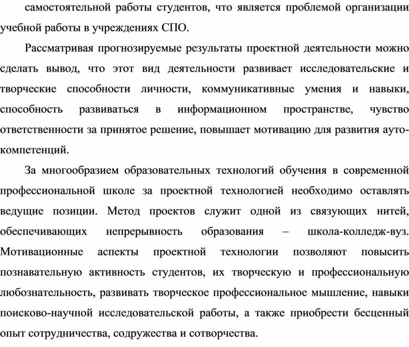 За многообразием образовательных технологий обучения в современной профессиональной школе за проектной технологией необходимо оставлять ведущие позиции. Метод проектов служит одной из связующих нитей, обеспечивающих непрерывность образования – школа-колледж-вуз. Мотивационные аспекты проектной технологии позволяют повысить познавательную активность студентов, их творческую и профессиональную любознательность, развивать творческое профессиональное мышление, навыки поисково-научной исследовательской работы, а также приобрести бесценный опыт сотрудничества, содружества и сотворчества.