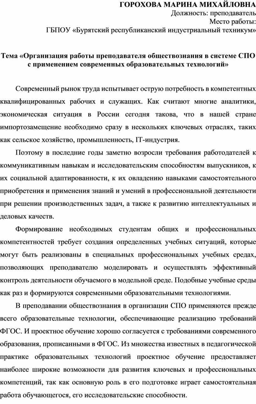 В преподавании обществознания в организации СПО применяются прежде всего образовательные технологии, обеспечивающие реализацию требований ФГОС. И проектное обучение хорошо согласуется с требованиями современного образования, прописанными в ФГОС. Из множества известных в педагогической практике образовательных технологий проектное обучение предоставляет наиболее широкие возможности для развития ключевых и профессиональных компетенций, так как основную роль в его подготовке играет самостоятельная работа обучающегося, его исследовательские способности.