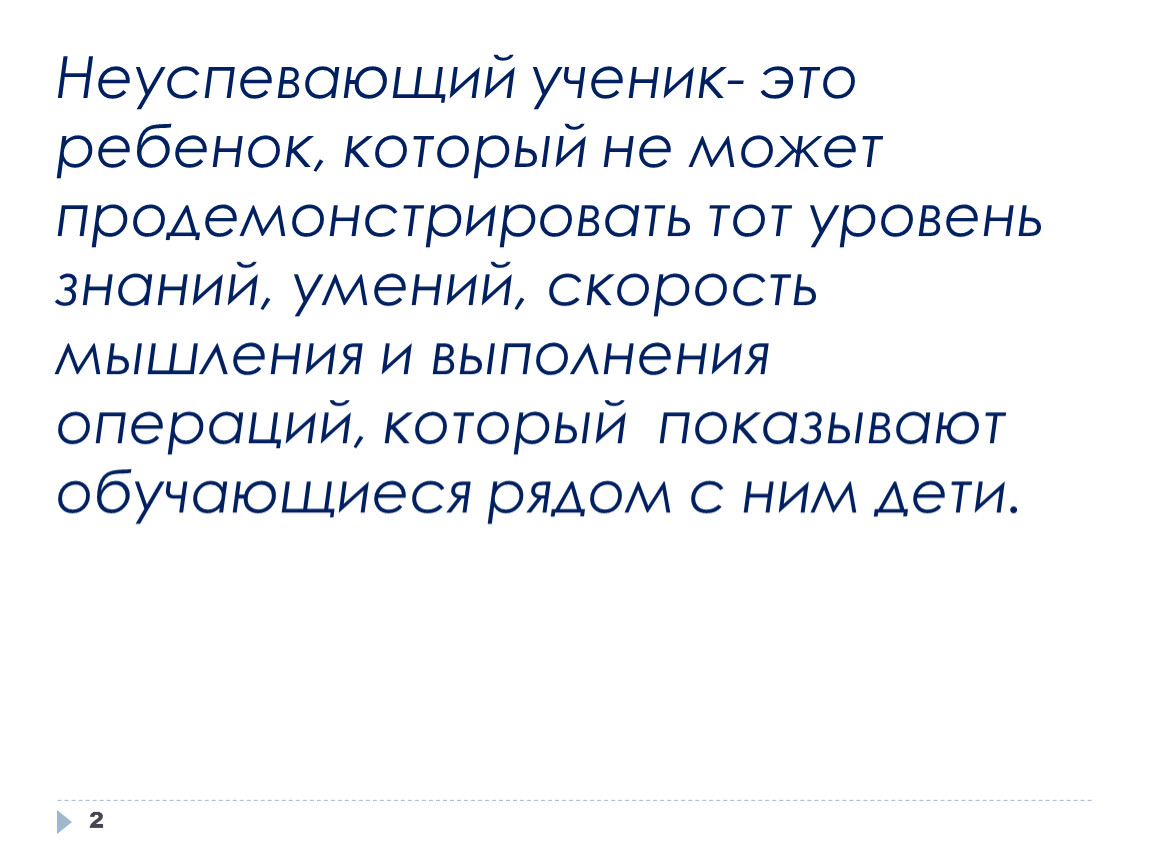 Неуспевающий ученик- это ребенок, который не может продемонстрировать тот уровень знаний, умений, скорость мышления и выполнения операций, который показывают обучающиеся рядом с ним дети.