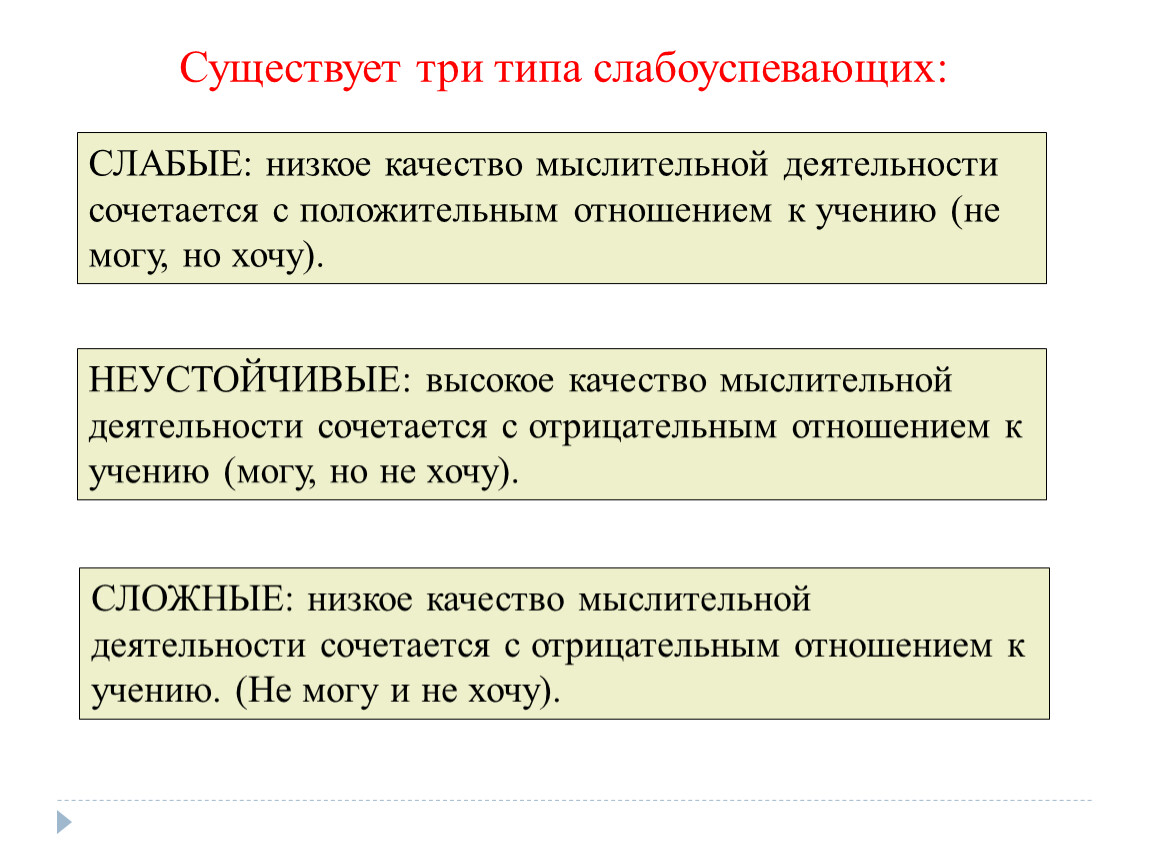 Существует три типа слабоуспевающих: