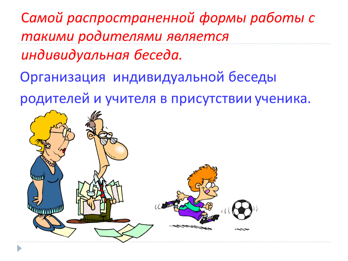 Самой распространенной формы работы с такими родителями является индивидуальная беседа.