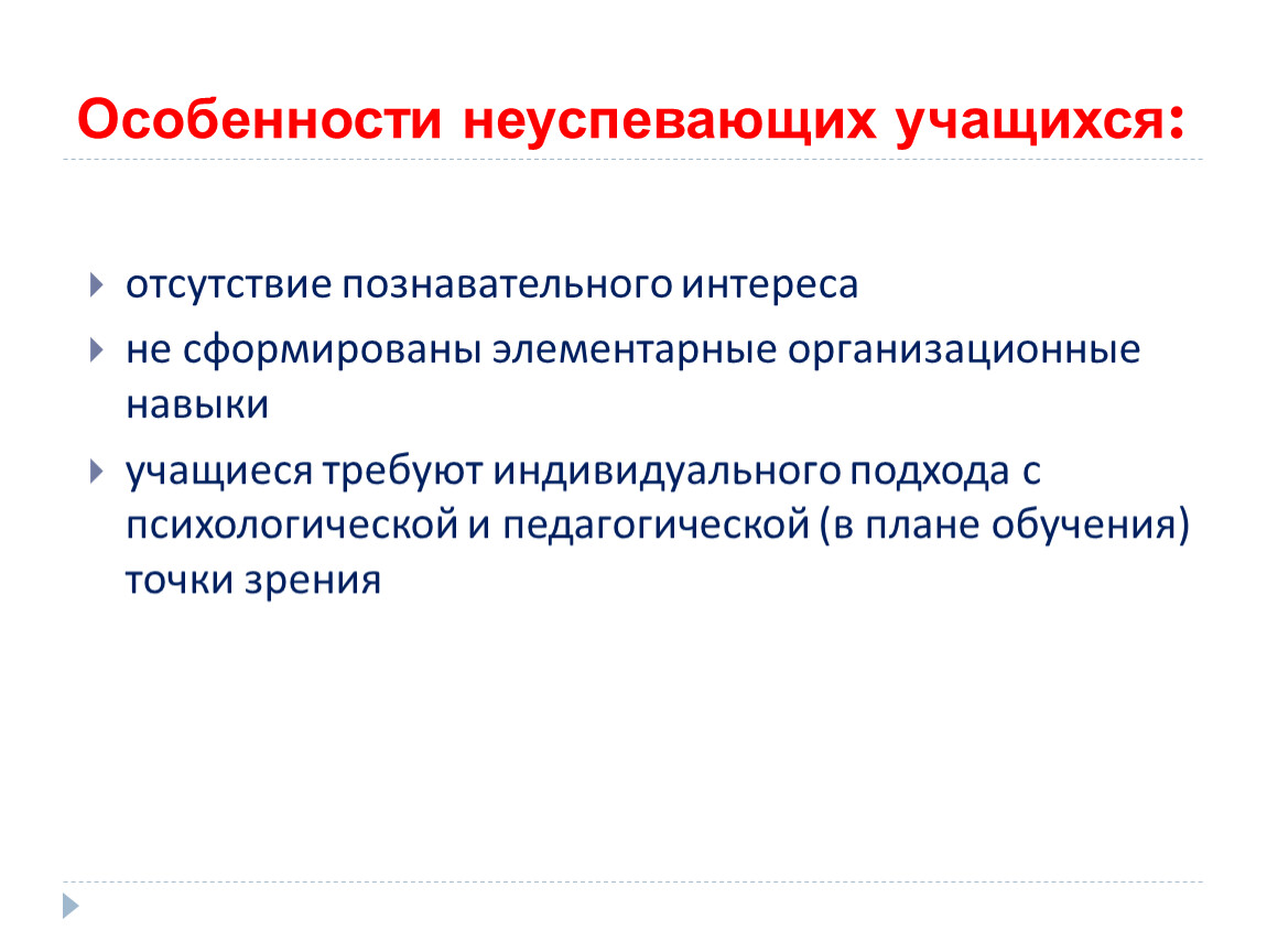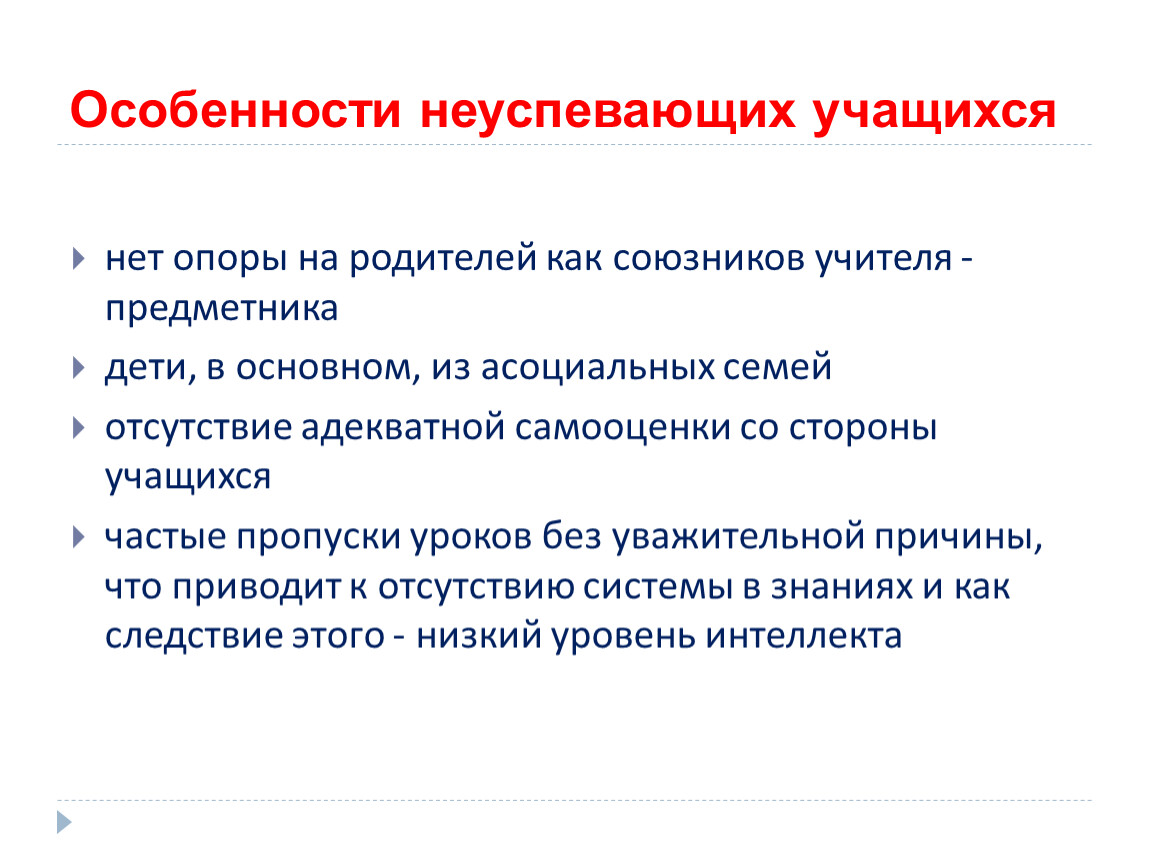 Особенности неуспевающих учащихся: