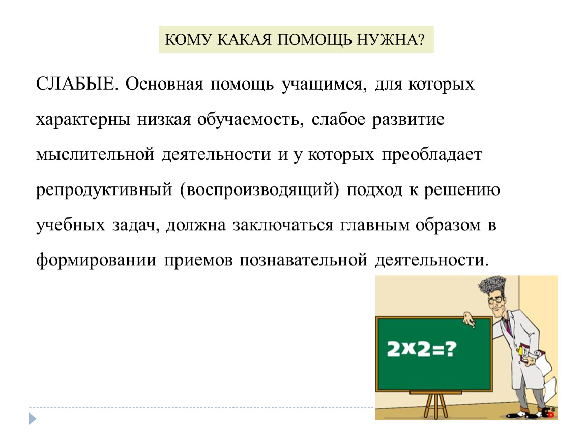 СЛАБЫЕ. Основная помощь учащимся, для которых характерны низкая обучаемость, слабое развитие мыслительной деятельности и у которых преобладает репродуктивный (воспроизводящий) подход к решению учебных задач, должна заключаться главным образом в формировании приемов познавательной деятельности.