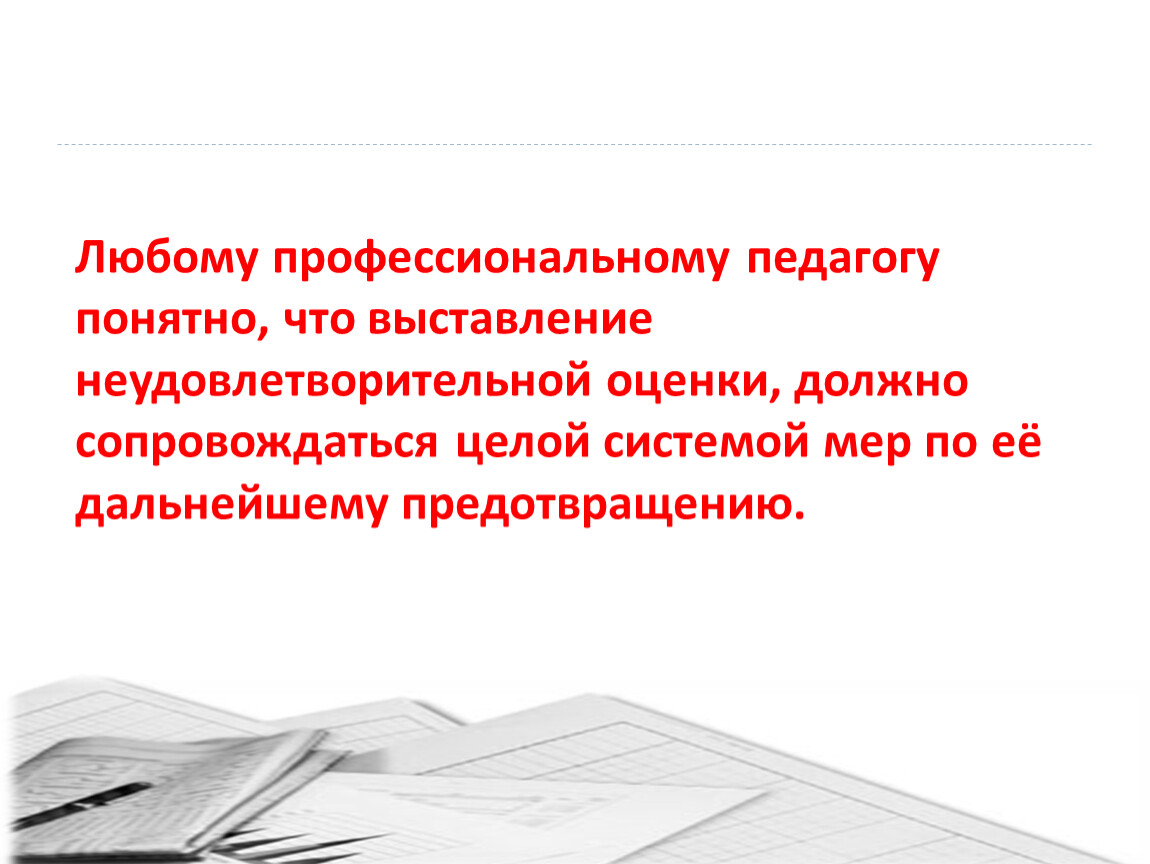 Любому профессиональному педагогу понятно, что выставление неудовлетворительной оценки, должно сопровождаться целой системой мер по её дальнейшему предотвращению.