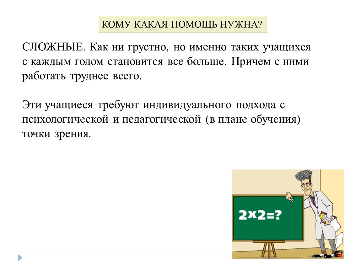 Эти учащиеся требуют индивидуального подхода с психологической и педагогической (в плане обучения) точки зрения.