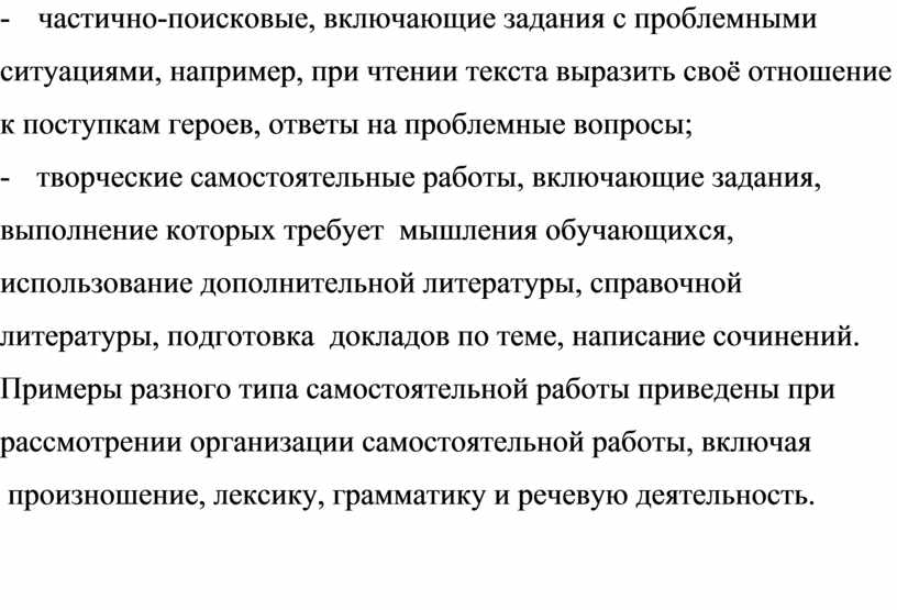 Примеры разного типа самостоятельной работы приведены при рассмотрении организации самостоятельной работы, включая
