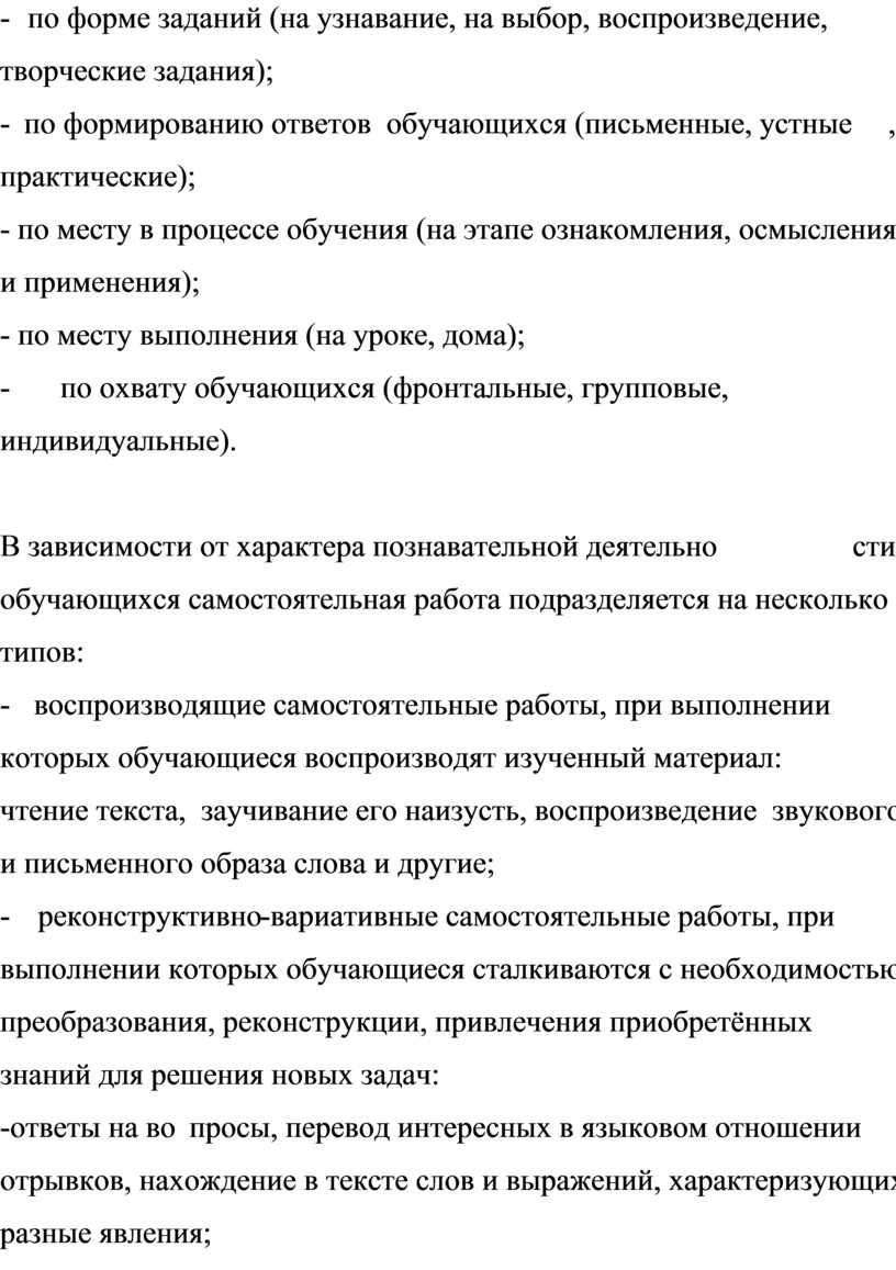 Организуя самостоятельную работу, учителям следует помнить, то самостоятельная работа может классифицироваться по разным признакам: