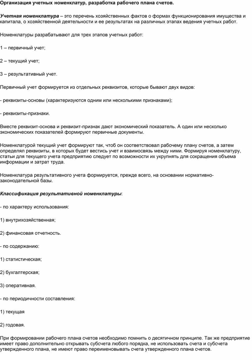 Организация учетных номенклатур, разработка рабочего плана счетов.