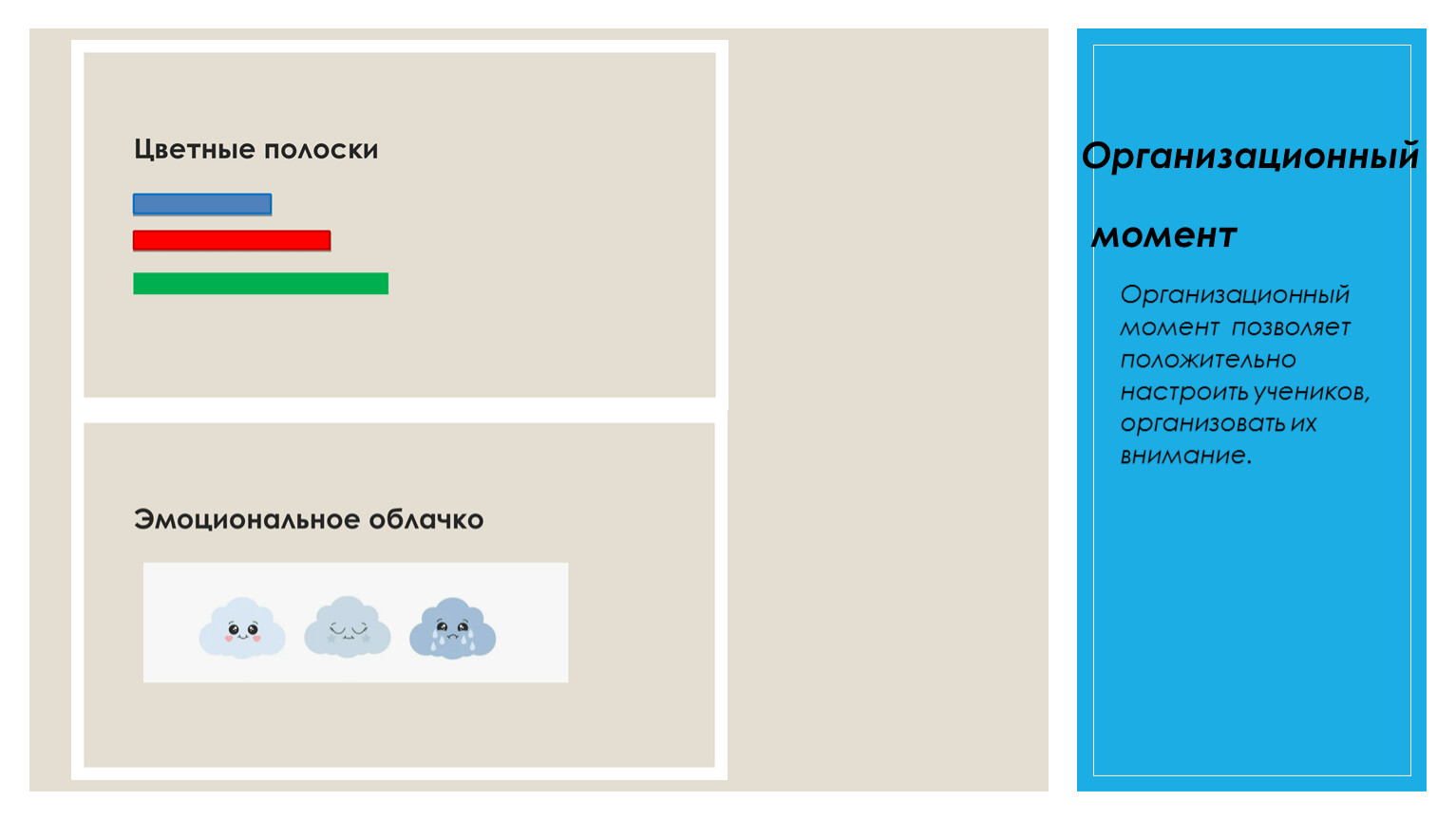 Организационный момент позволяет положительно настроить учеников, организовать их внимание.