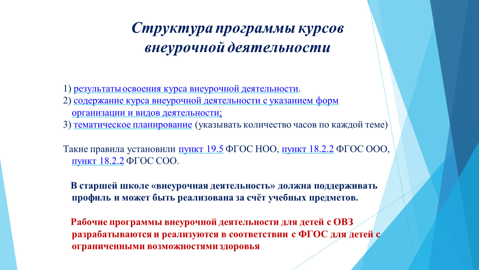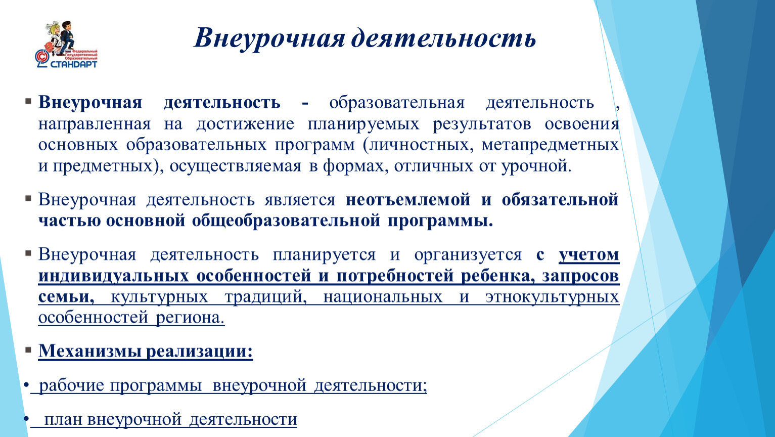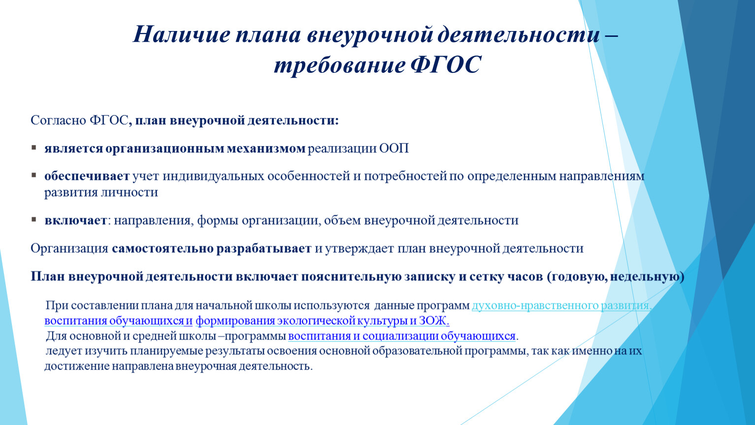▶ Внеурочная деятельность – обязательная часть основной образовательной программы (п. 16 ФГОС начального общего образования, п. 13 ФГОС основного общего образования, п. 13 ФГОС среднего общего образования). Программы внеурочной деятельности педагоги обязаны разработать и представить в полном