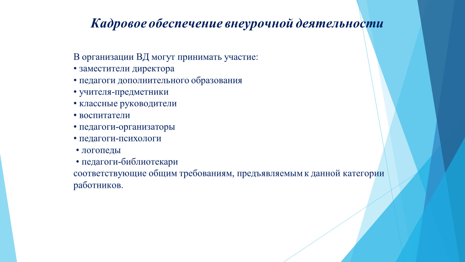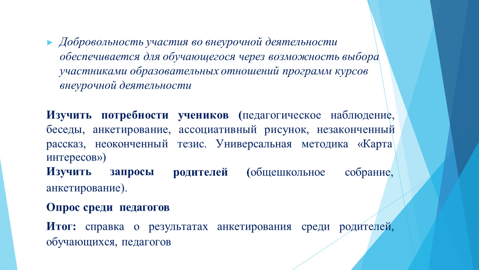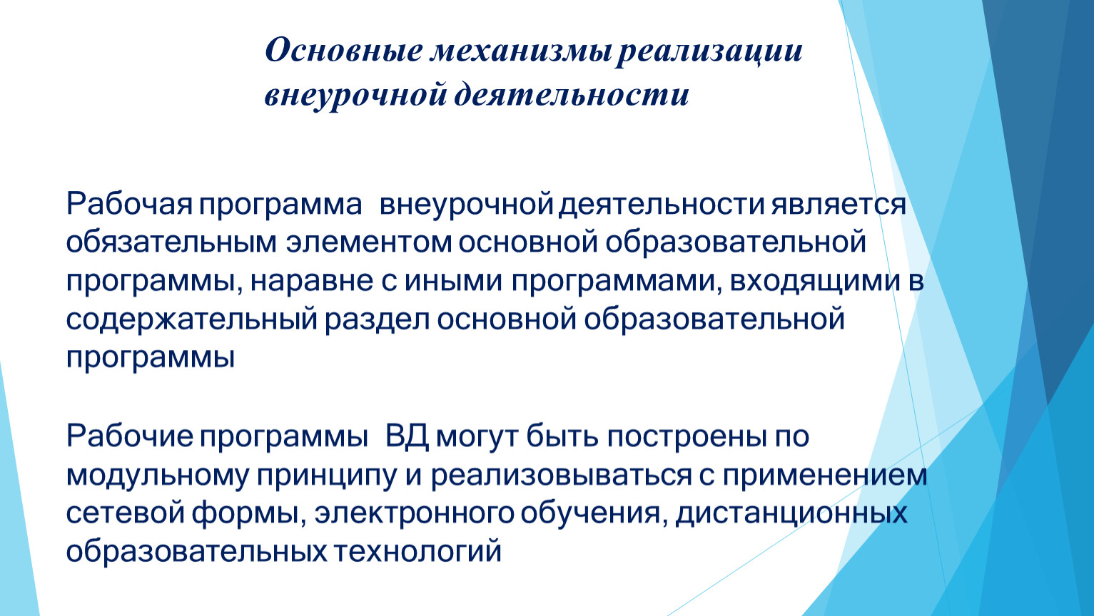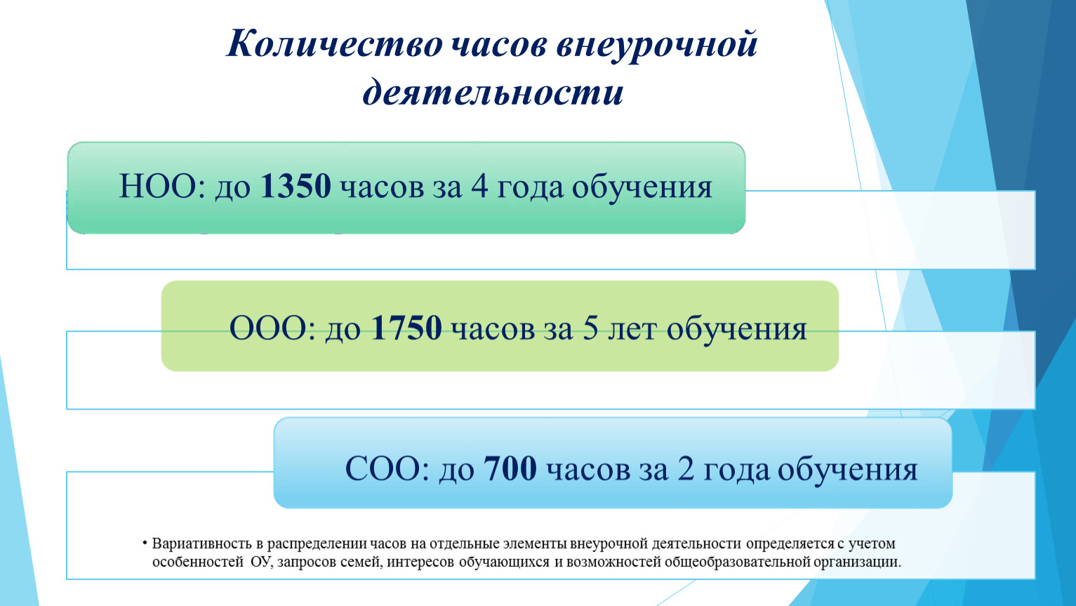 ▶ Внеурочная деятельность – обязательная часть основной образовательной программы (п. 16 ФГОС начального общего образования, п. 13 ФГОС основного общего образования, п. 13 ФГОС среднего общего образования). Программы внеурочной деятельности педагоги обязаны разработать и представить в полном