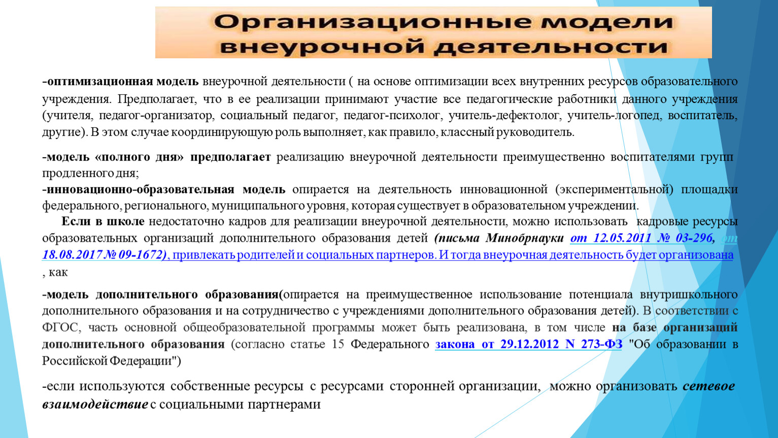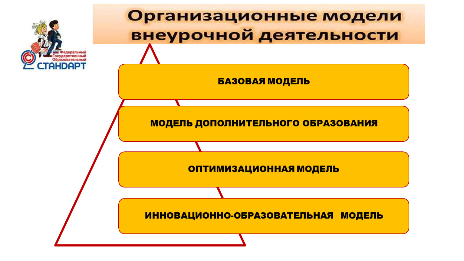 -модель дополнительного образования(опирается на преимущественное использование потенциала внутришкольного дополнительного образования и на сотрудничество с учреждениями дополнительного образования детей). В соответствии с ФГОС, часть основной общеобразовательной программы может быть реализована, в том числе на базе организаций дополнительного образования (согласно статье 15 Федерального закона от 29.12.2012 N 273-ФЗ "Об образовании в Российской Федерации")