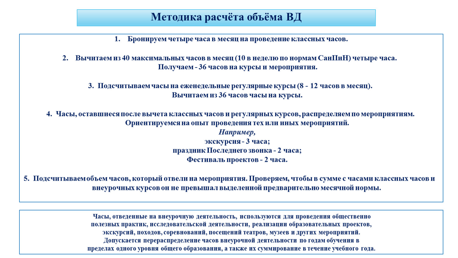 Подсчитываем объем часов, который отвели на мероприятия. Проверяем, чтобы в сумме с часами классных часов и внеурочных курсов он не превышал выделенной предварительно месячной нормы.