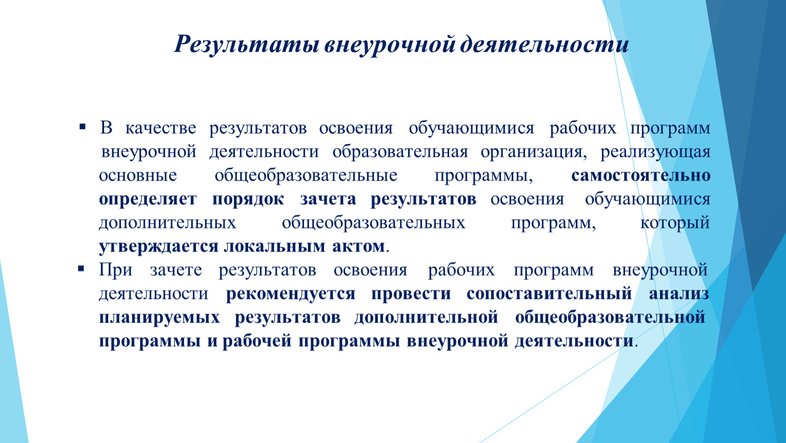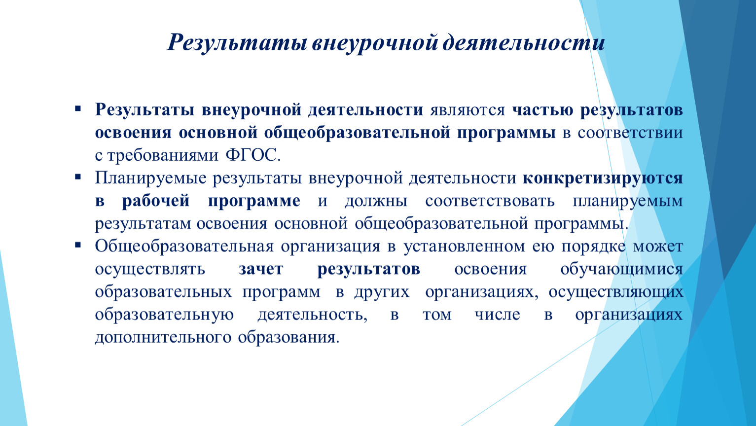 Результаты внеурочной деятельности являются частью результатов освоения основной общеобразовательной программы в соответствии с требованиями ФГОС.