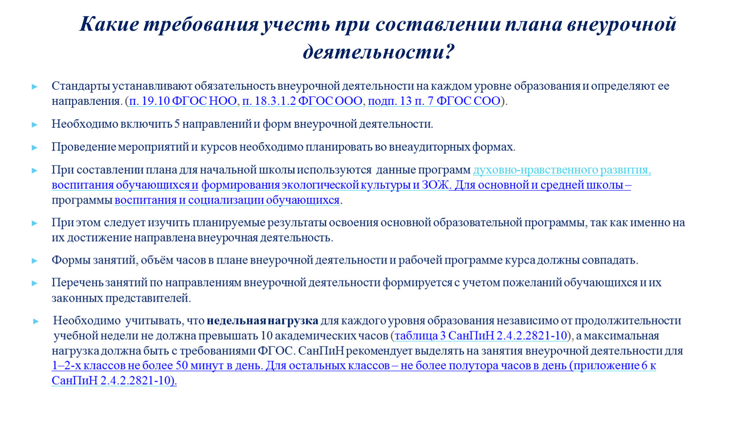 нагрузка должна быть с требованиями ФГОС. СанПиН рекомендует выделять на занятия внеурочной деятельности для 1–2-х классов не более 50 минут в день. Для остальных классов – не более полутора часов в день (приложение 6 к СанПиН 2.4.2.2821-10).