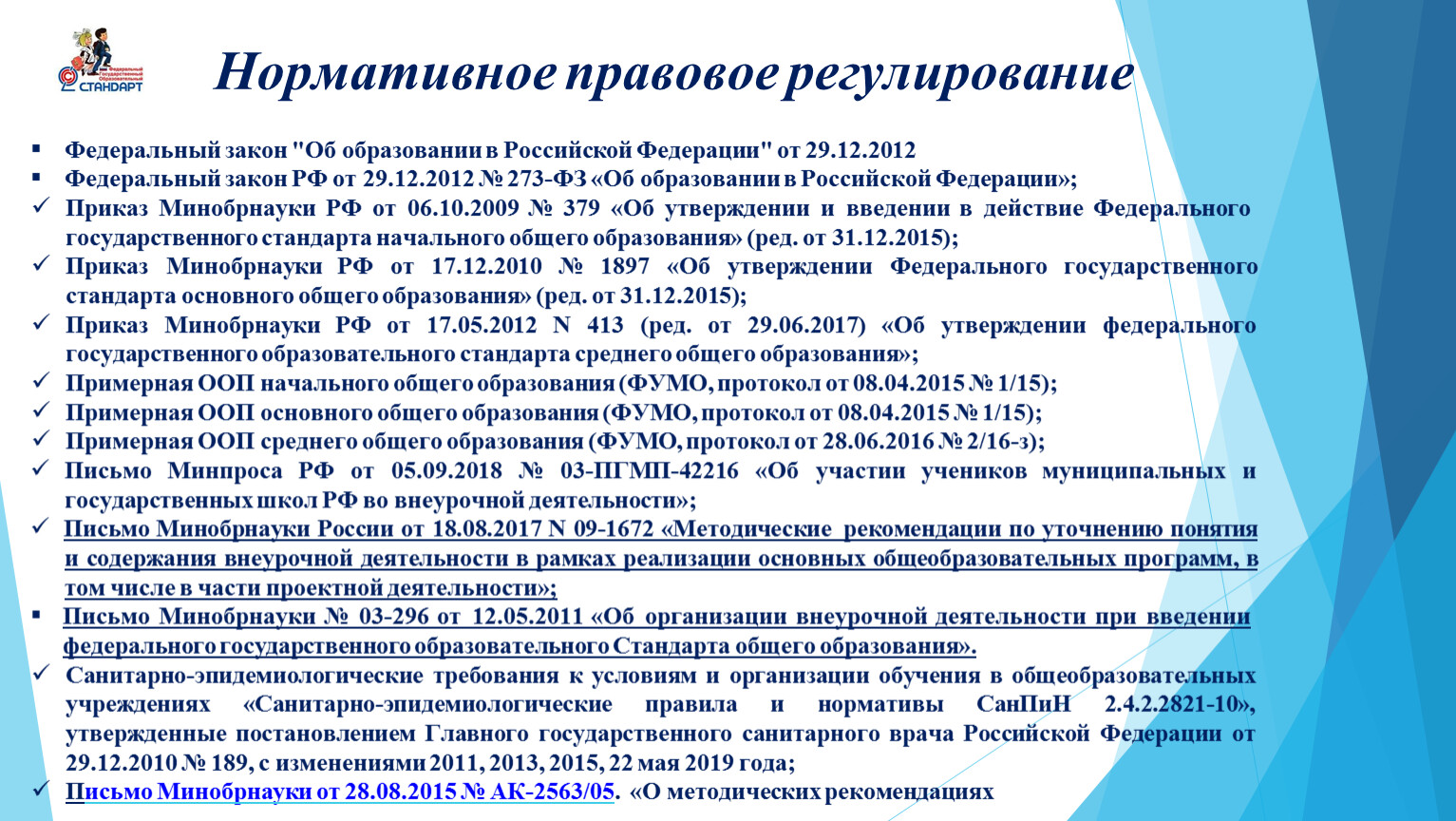 Письмо Минобрнауки России от 18.08.2017 N 09-1672 «Методические рекомендации по уточнению понятия и содержания внеурочной деятельности в рамках реализации основных общеобразовательных программ, в том числе в части проектной деятельности»;