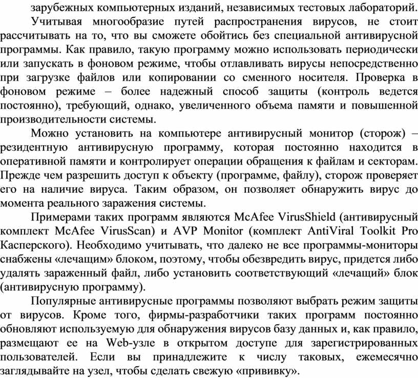 Примерами таких программ являются McAfee VirusShield (антивирусный комплект McAfee VirusScan) и AVP Monitor (комплект AntiViral Toolkit Pro Касперского). Необходимо учитывать, что далеко не все программы-мониторы снабжены «лечащим» блоком, поэтому, чтобы обезвредить вирус, придется либо удалять зараженный файл, либо установить соответствующий «лечащий» блок (антивирусную программу).