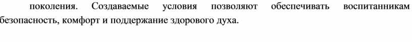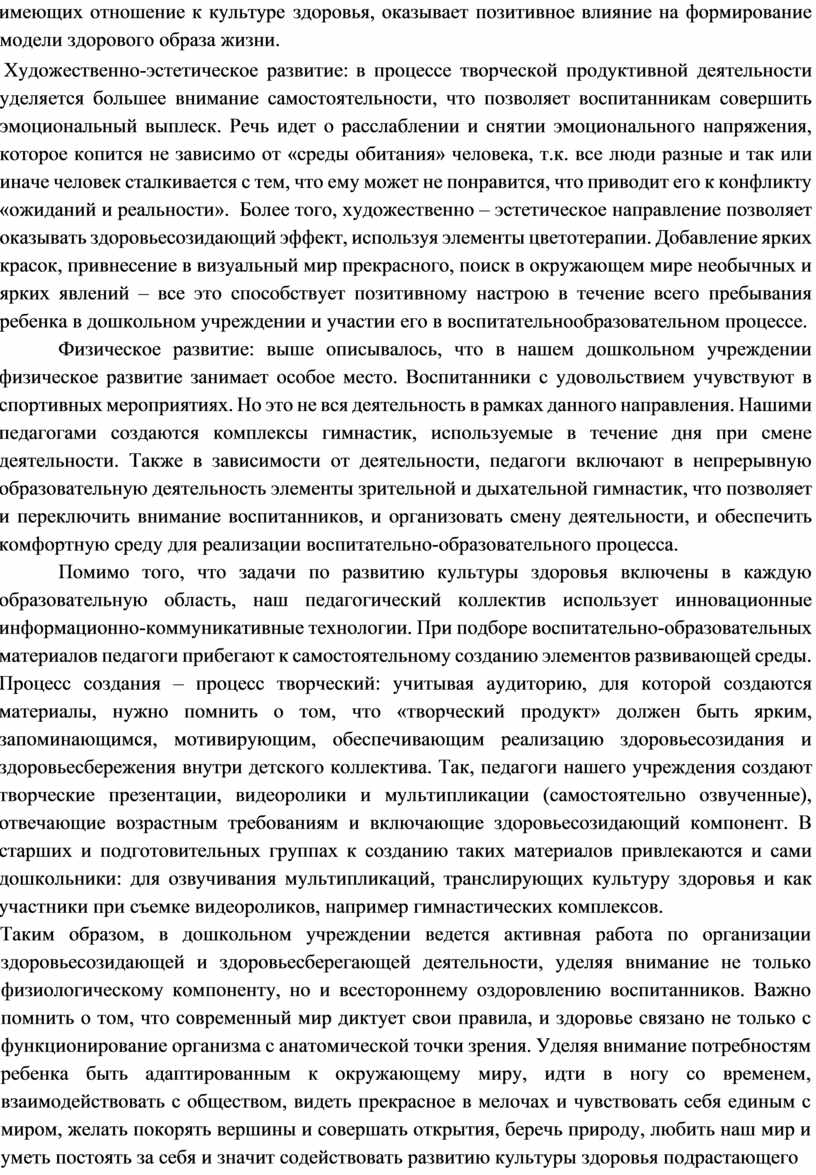 Таким образом, в дошкольном учреждении ведется активная работа по организации здоровьесозидающей и здоровьесберегающей деятельности, уделяя внимание не только физиологическому компоненту, но и всестороннему оздоровлению воспитанников. Важно помнить о том, что современный мир диктует свои правила, и здоровье связано не только с функционирование организма с анатомической точки зрения. Уделяя внимание потребностям ребенка быть адаптированным к окружающему миру, идти в ногу со временем, взаимодействовать с обществом, видеть прекрасное в мелочах и чувствовать себя единым с миром, желать покорять вершины и совершать открытия, беречь природу, любить наш мир и уметь постоять за себя и значит содействовать развитию культуры здоровья подрастающего поколения. Создаваемые условия позволяют обеспечивать воспитанникам безопасность, комфорт и поддержание здорового духа.