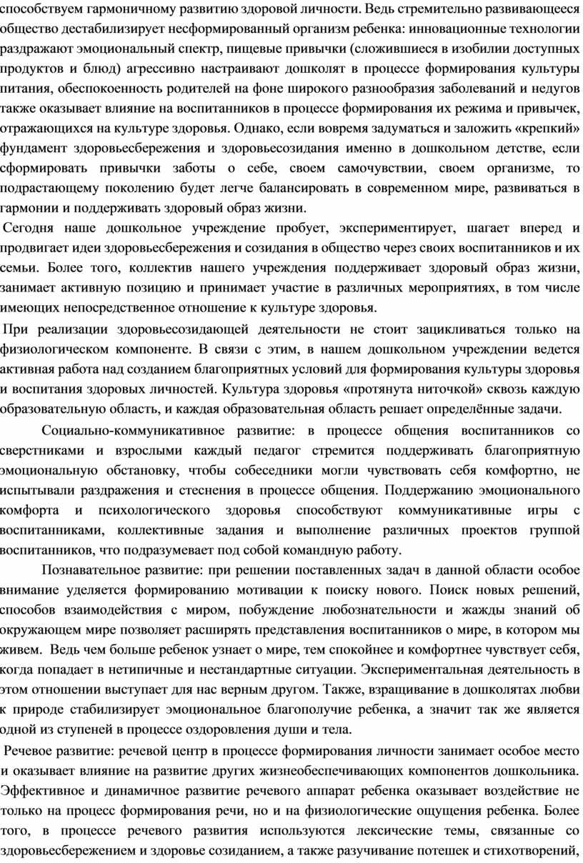 При реализации здоровьесозидающей деятельности не стоит зацикливаться только на физиологическом компоненте. В связи с этим, в нашем дошкольном учреждении ведется активная работа над созданием благоприятных условий для формирования культуры здоровья и воспитания здоровых личностей. Культура здоровья «протянута ниточкой» сквозь каждую образовательную область, и каждая образовательная область решает определённые задачи.