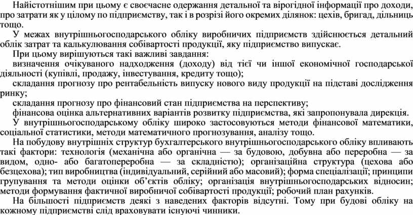 Отже, внутрішньогосподарський облік за інформаційним змістом і колом вирішуваних завдань набагато ширший і різноманітніший, ніж фінансовий. Він повністю підпорядкований запитам менеджерів підприємства. Його дієвість забезпечується орієнтацією на конкретні господарські завдання, вирішення яких ґрунтується на відповідній інформації про витрати і доходи.