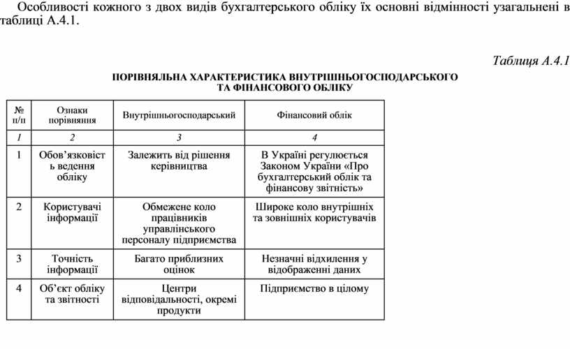 Особливості кожного з двох видів бухгалтерського обліку їх основні відмінності узагальнені в таблиці А.4.1.