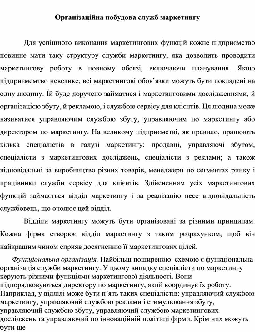 Функціональна організація. Найбільш поширеною схемою є функціональна організація служби маркетингу. У цьому випадку спеціалісти по маркетингу керують різними функціями маркетингової діяльності. Вони підпорядковуються директору по маркетингу, який координує їх роботу. Наприклад, у відділі може бути п’ять таких спеціалістів: управляючий службою маркетингу, управляючий службою реклами і стимулювання збуту, управляючий службою збуту, управляючий службою маркетингових досліджень та управляючий по інноваційній політиці фірми. Крім них можуть бути ще управляючий службою сервісу, управляючий службою планування маркетингу та управляючий службою товароруху.