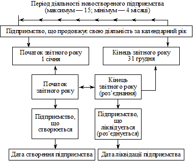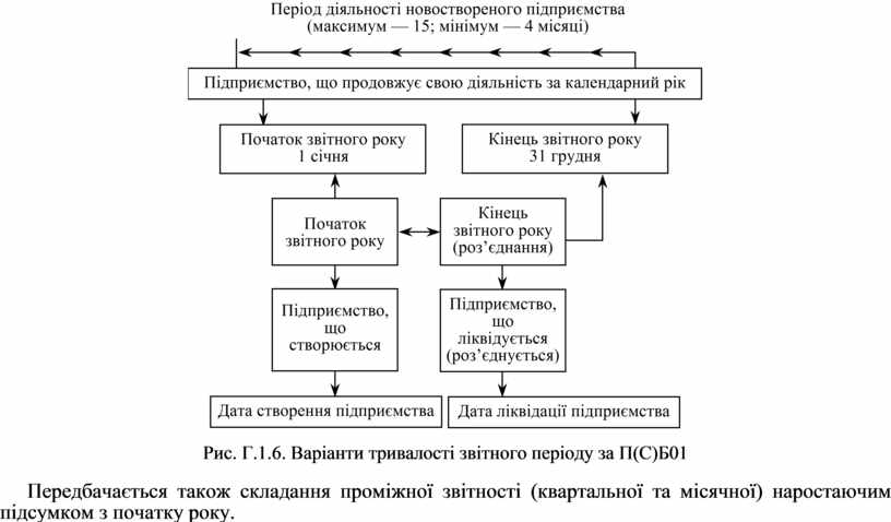 За П(С)БО 1 звітний період складає календарний рік. Проте для новоствореного підприємства або яке ліквідується, тривалість звітного періоду може бути іншою (рис. Г.1.6).