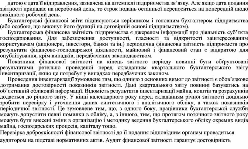 Датою подання бухгалтерської звітності для підприємства, установи межах одного міста вважається день фактичного передавання її за належністю. Для іногороднього підприємства такою датою є дата її відправлення, зазначена на штемпелі підприємства зв’язку. Але якщо дата подання звітності припадає на неробочий день, то строк подань останньої переноситься на попередній щодо вихідного робочий день.