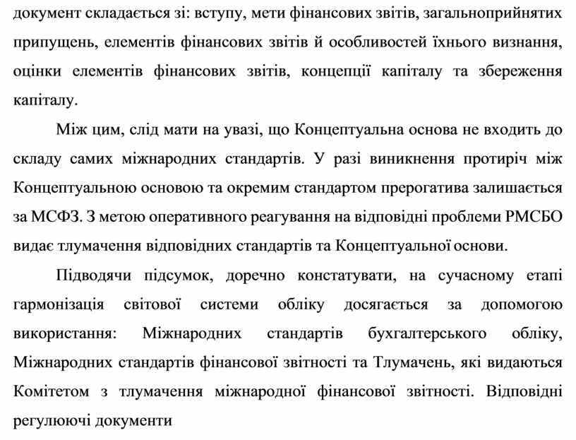 Підводячи підсумок, доречно констатувати, на сучасному етапі гармонізація світової системи обліку досягається за допомогою використання: Міжнародних стандартів бухгалтерського обліку, Міжнародних стандартів фінансової звітності та Тлумачень, які видаються Комітетом з тлумачення міжнародної фінансової звітності. Відповідні регулюючі документи