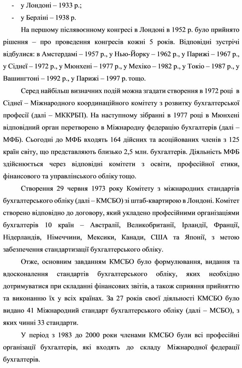 Серед найбільш визначних подій можна згадати створення в 1972 році в Сіднеї – Міжнародного координаційного комітету з розвитку бухгалтерської професії (далі – МККРБП). На наступному зібранні в 1977 році в Мюнхені відповідний орган перетворено в Міжнародну федерацію бухгалтерів (далі – МФБ). Сьогодні до МФБ входять 164 дійсних та асоційованих членів з 125 країн світу, що представляють близько 2,5 млн. бухгалтерів. Діяльність МФБ здійснюється через відповідні комітети з освіти, професійної етики, фінансового та управлінського обліку тощо.