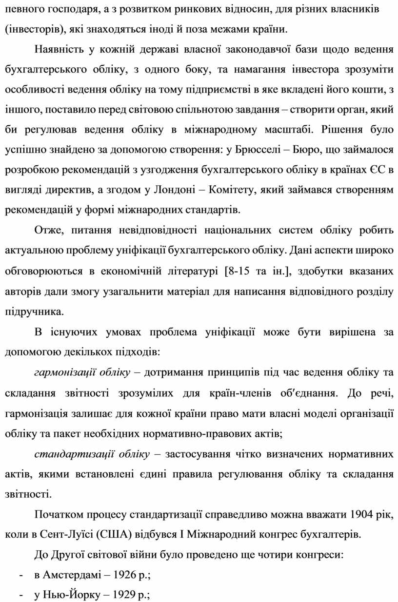 Отже, питання невідповідності національних систем обліку робить актуальною проблему уніфікації бухгалтерського обліку. Дані аспекти широко обговорюються в економічній літературі [8-15 та ін.], здобутки вказаних авторів дали змогу узагальнити матеріал для написання відповідного розділу підручника.