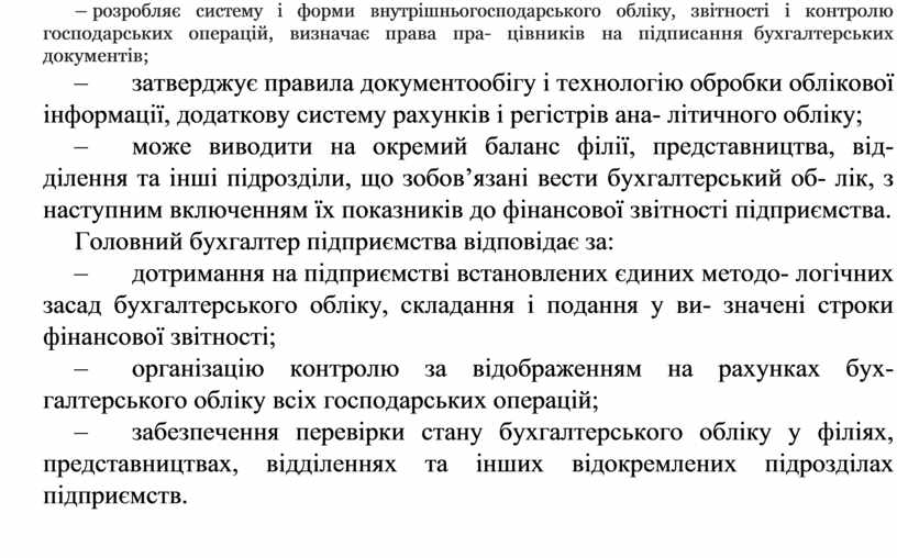 – розробляє систему і форми внутрішньогосподарського обліку, звітності і контролю господарських операцій, визначає права пра- цівників на підписання бухгалтерських документів;