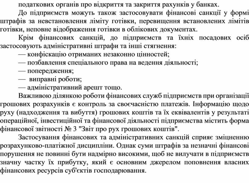 Застосування фінансових та адміністративних санкцій сприяє зміцненню розрахунково-платіжної дисципліни. Однак суми штрафів за незначні фінансові порушення не повинні бути надмірно високими, щоб не вилучати в підприємств значну частку їх прибутку, який є основним джерелом поповнення власних фінансових ресурсів суб'єктів господарювання.