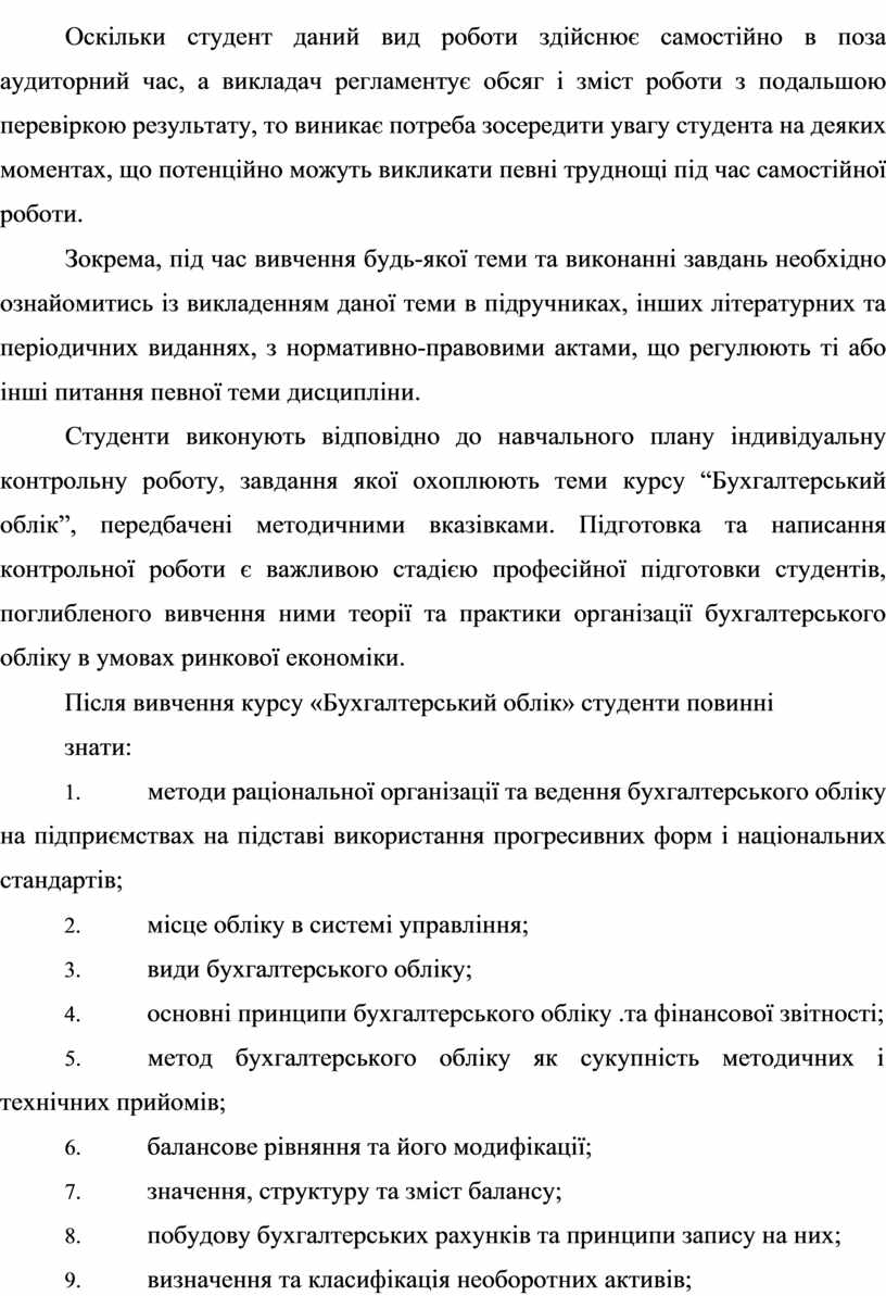 Студенти виконують відповідно до навчального плану індивідуальну контрольну роботу, завдання якої охоплюють теми курсу “Бухгалтерський облік”, передбачені методичними вказівками. Підготовка та написання контрольної роботи є важливою стадією професійної підготовки студентів, поглибленого вивчення ними теорії та практики організації бухгалтерського обліку в умовах ринкової економіки.