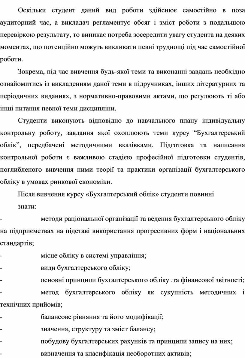 Студенти виконують відповідно до навчального плану індивідуальну контрольну роботу, завдання якої охоплюють теми курсу “Бухгалтерський облік”, передбачені методичними вказівками. Підготовка та написання контрольної роботи є важливою стадією професійної підготовки студентів, поглибленого вивчення ними теорії та практики організації бухгалтерського обліку в умовах ринкової економіки.