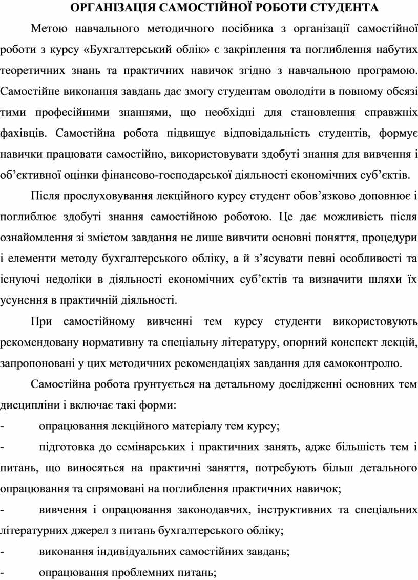 Метою навчального методичного посібника з організації самостійної роботи з курсу «Бухгалтерський облік» є закріплення та поглиблення набутих теоретичних знань та практичних навичок згідно з навчальною програмою. Самостійне виконання завдань дає змогу студентам оволодіти в повному обсязі тими професійними знаннями, що необхідні для становлення справжніх фахівців. Самостійна робота підвищує відповідальність студентів, формує навички працювати самостійно, використовувати здобуті знання для вивчення і об’єктивної оцінки фінансово-господарської діяльності економічних суб’єктів.
