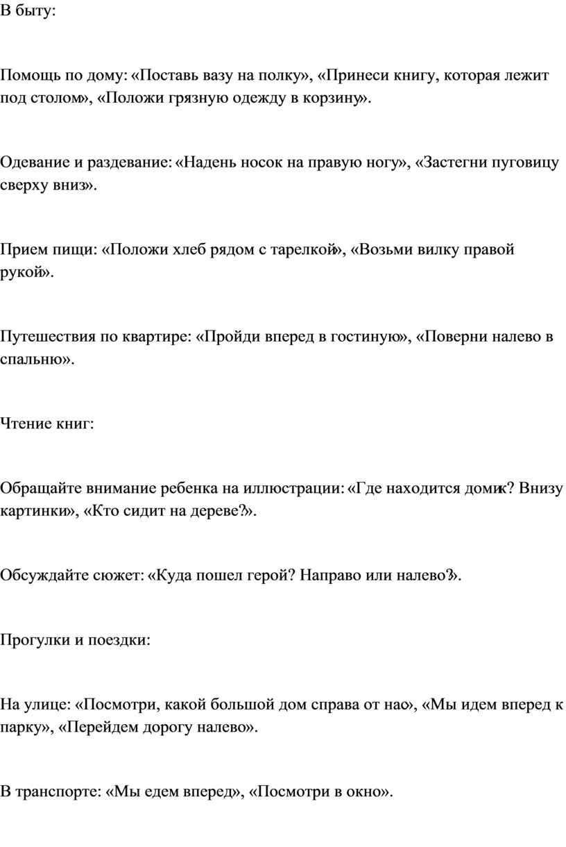 На прогулке: «Посмотри, какое высокое дерево справа от нас», «Пройдем налево к песочнице».