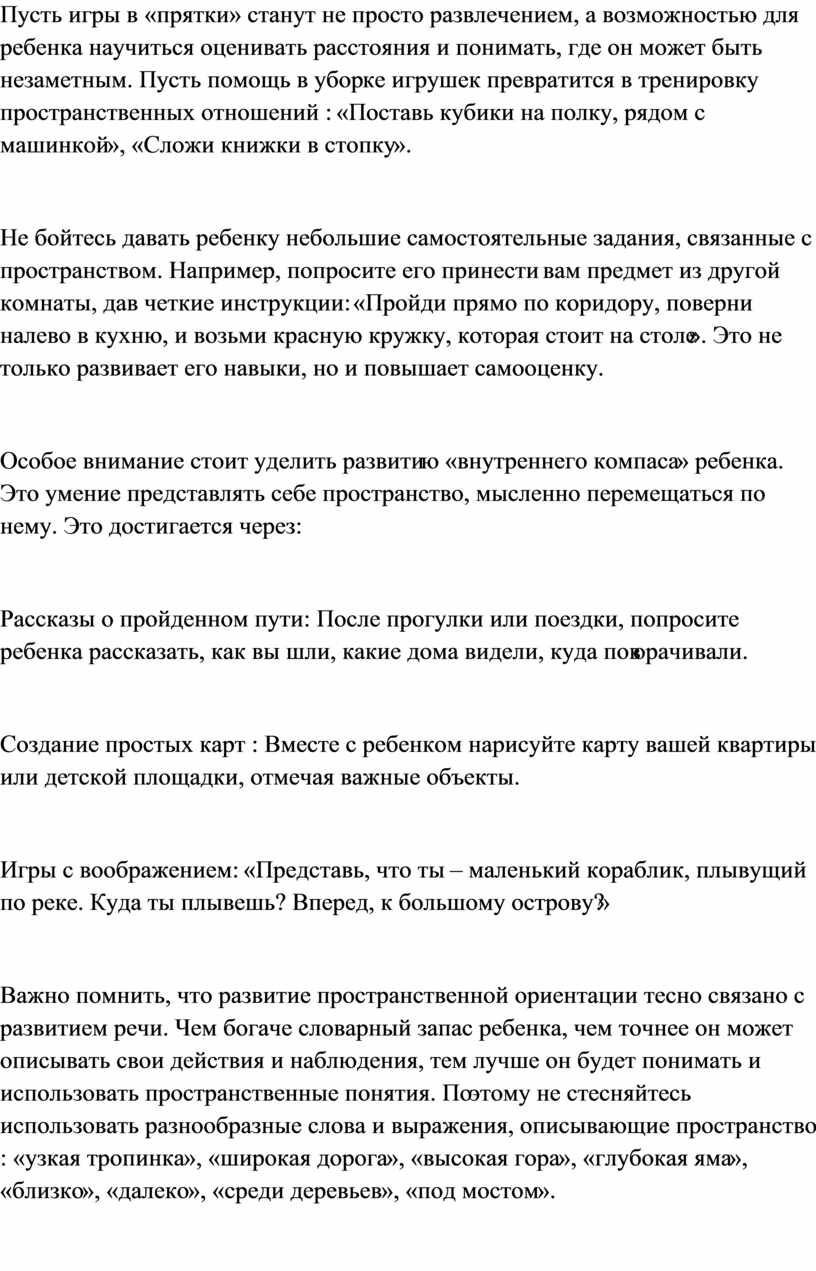 Пусть игры в «прятки» станут не просто развлечением, а возможностью для ребенка научиться оценивать расстояния и понимать, где он может быть незаметным. Пусть помощь в уборке игрушек превратится в тренировку пространственных отношений : «Поставь кубики на полку, рядом с машинкой», «Сложи книжки в стопку».