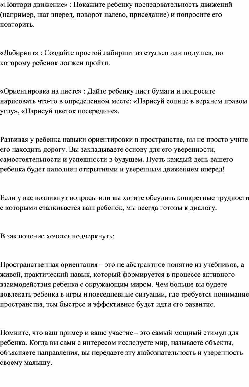 Используйте наглядность: Карты, схемы, рисунки, даже простые стрелки на полу могут помочь ребенку лучше понять пространственные отношения.