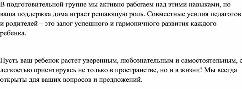 В подготовительной группе мы активно работаем над этими навыками, но ваша поддержка дома играет решающую роль. Совместные усилия педагогов и родителей – это залог успешного и гармоничного развития каждого ребенка.