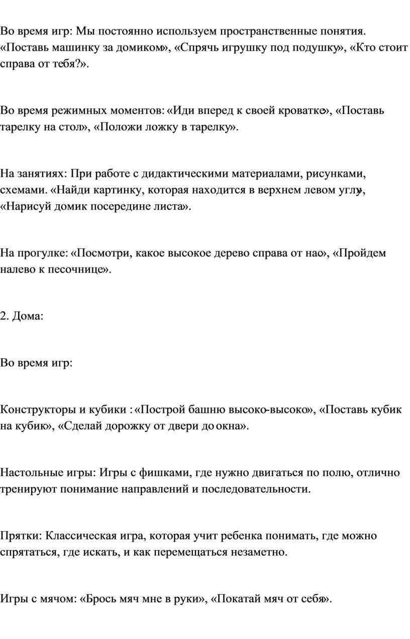 Во время игр: Мы постоянно используем пространственные понятия. «Поставь машинку за домиком», «Спрячь игрушку под подушку», «Кто стоит справа от тебя?».
