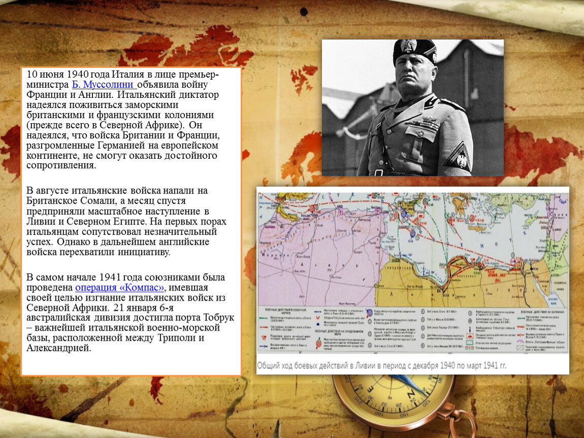 10 июня 1940 года Италия в лице премьер-министра Б. Муссолини объявила войну Франции и Англии. Итальянский диктатор надеялся поживиться заморскими британскими и французскими колониями (прежде всего в Северной Африке). Он надеялся, что войска Британии и Франции, разгромленные Германией на европейском континенте, не смогут оказать достойного сопротивления.