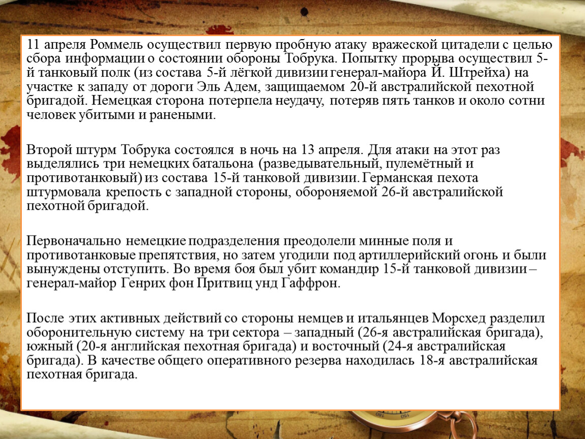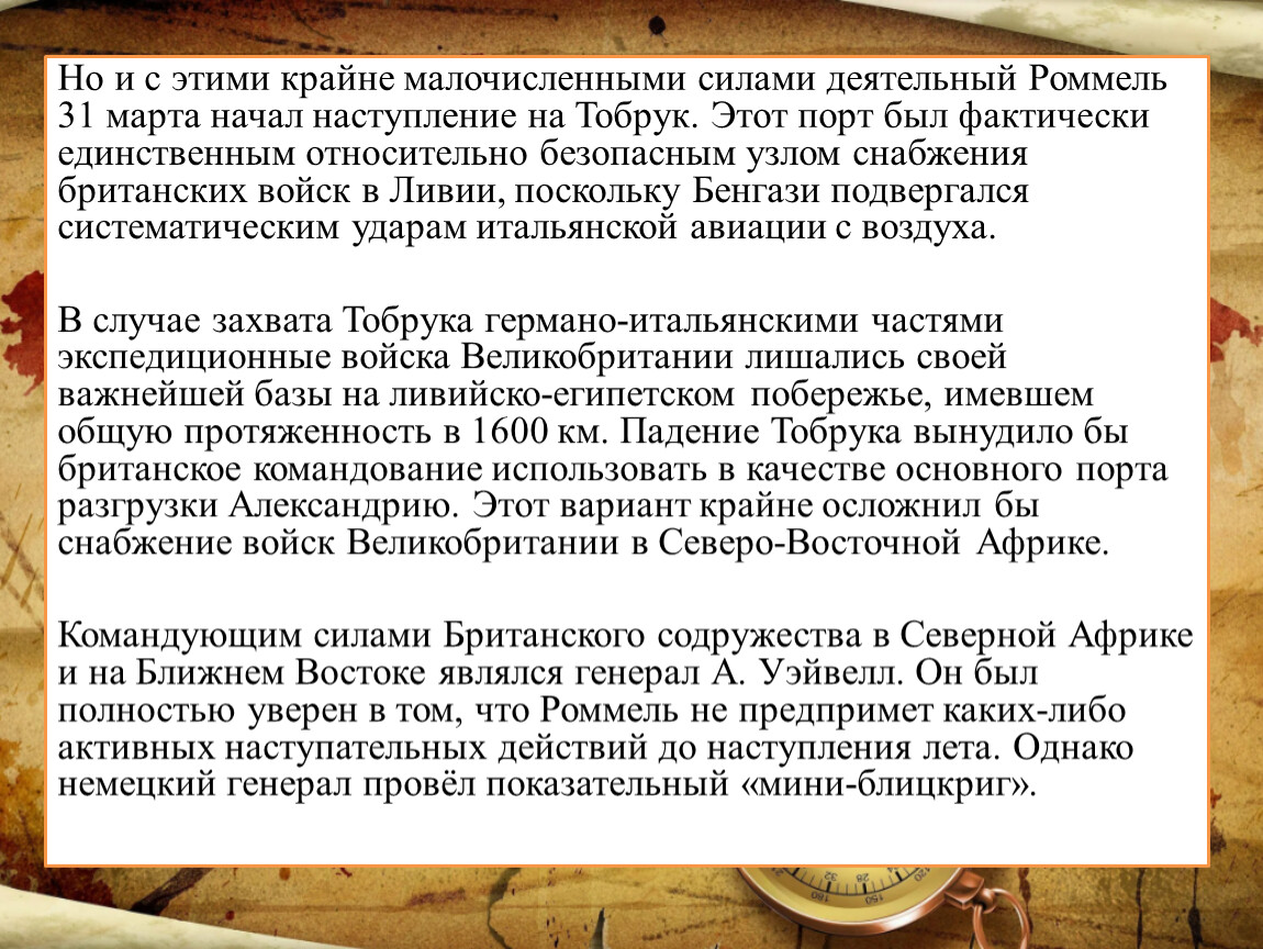 Но и с этими крайне малочисленными силами деятельный Роммель 31 марта начал наступление на Тобрук. Этот порт был фактически единственным относительно безопасным узлом снабжения британских войск в Ливии, поскольку Бенгази подвергался систематическим ударам итальянской авиации с воздуха.