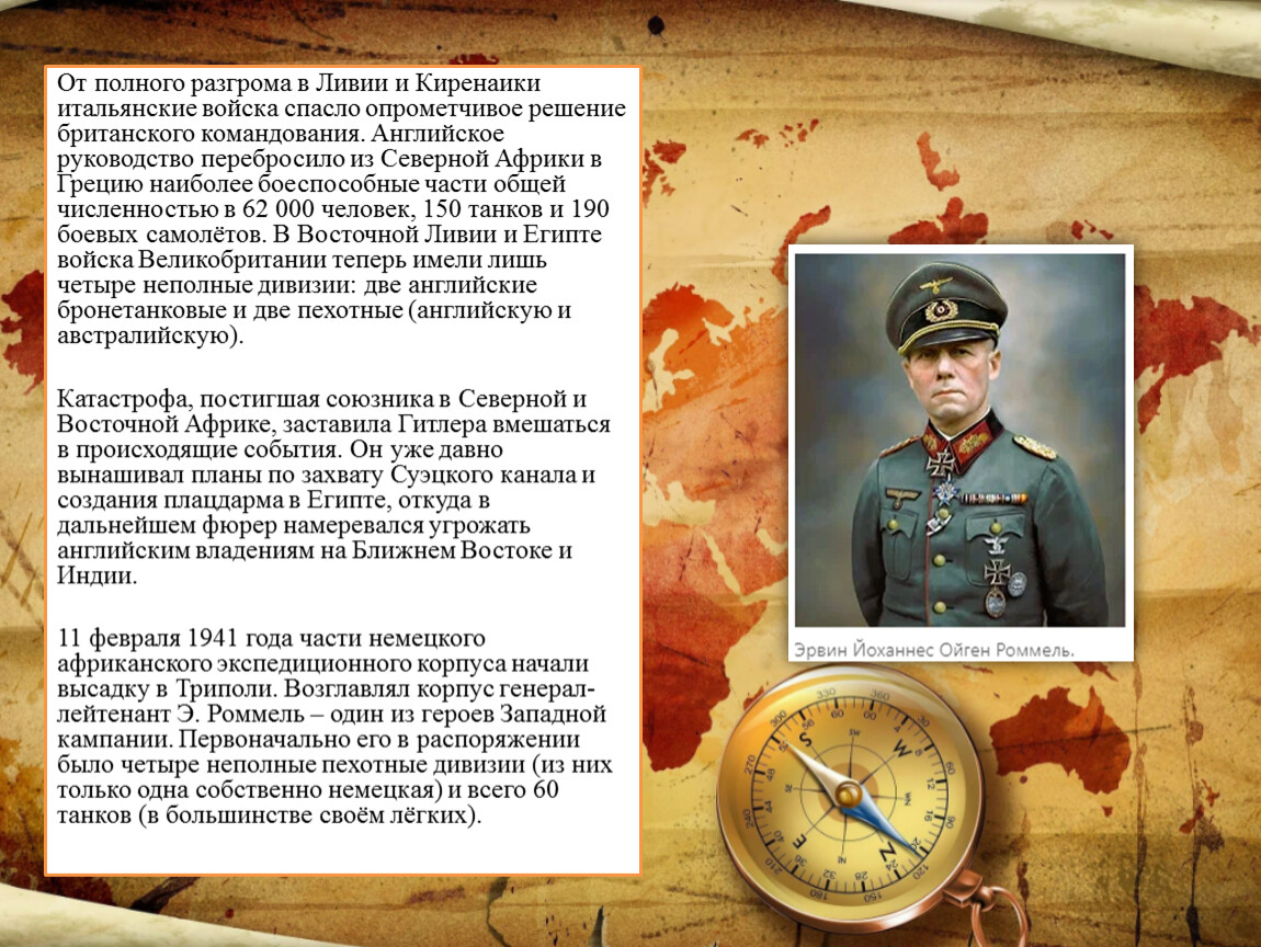 11 февраля 1941 года части немецкого африканского экспедиционного корпуса начали высадку в Триполи. Возглавлял корпус генерал-лейтенант Э. Роммель – один из героев Западной кампании. Первоначально его в распоряжении было четыре неполные пехотные дивизии (из них только одна собственно немецкая) и всего 60 танков (в большинстве своём лёгких).