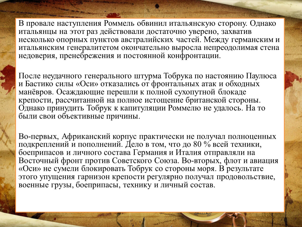 Во-первых, Африканский корпус практически не получал полноценных подкреплений и пополнений. Дело в том, что до 80 % всей техники, боеприпасов и личного состава Германия и Италия отправляли на Восточный фронт против Советского Союза. Во-вторых, флот и авиация «Оси» не сумели блокировать Тобрук со стороны моря. В результате этого упущения гарнизон крепости регулярно получал продовольствие, военные грузы, боеприпасы, технику и личный состав.