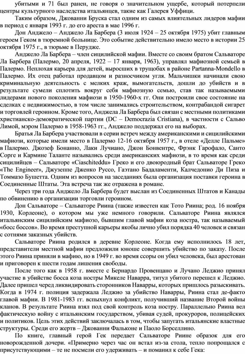 Мы не станем здесь разбирать всех «подвигов» Бруско. Отметим только, что фрагмент его подлинной биографии попал на страницы «Кромешника»: «Гек вспомнил, как во время пребывания на Сицилии он попытался из уважения к престарелому дону Паоло прищучить некоего тамошнего борзилу по кличке Свинтус (Джованни Бруска по прозвищу Свинья). Не успел, все мешался какой-то дурак-мотоциклист и местные лягавые опередили, буквально на минуты. Так вот этот Свинтус собирался взорвать Пизанскую башню, галерею Уффици и еще чего-то там бесценное для человечества…».